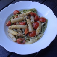 Heat olive oil in a pan and sauté the asparagus for 5 minutes. Add the honey-mustard sauce and cook for another 8 minutes. About a minute before finishing, add the tomatoes.