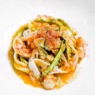 Use a vegetable peeler to remove the tough skin from the asparagus spears, then slice them lengthwise into thin strips resembling tagliatelle. Sauté for about two minutes until they become slightly tender, then transfer to a plate.