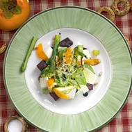 Arrange the asparagus, beetroot, and cheese on a plate, then add the salad leaves mixed with olive oil. Garnish with mandarin slices and toasted nuts.