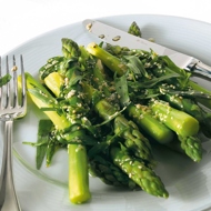 Remove the leaves from the tarragon stems and mix them with olive oil, sesame oil, crushed garlic, and sesame seeds (which can be lightly toasted in a dry skillet), along with salt and pepper. Drizzle this sauce over the asparagus and serve with a rosé wine, such as Catalan or Provençal.