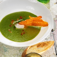 Lay the ham on a baking sheet, press down with another baking sheet on top, and place in an oven preheated to 356°F for fifteen minutes. Then, remove the top baking sheet and bake for another five minutes until it reaches a chip-like texture. In olive oil, sauté finely chopped onion and garlic for one minute, then add chopped asparagus and chicken broth, and cook for five minutes. Finally, add spinach, remove from heat, season with salt and pepper, and blend with an immersion blender.