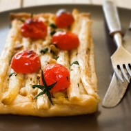 Mash the mozzarella and spread it on the pastry. Top with asparagus, tomatoes, and sprinkle with Parmesan. Bake for 15 minutes. Sprinkle with nuts and cook for another 5 minutes.