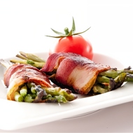 Divide the asparagus into 6 portions and wrap each in a slice of ham, leaving the tips of the asparagus visible. Place these rolls in a baking dish. Preheat the oven to 356°F.