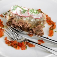 Leave the jellied meat to set overnight. Meanwhile, prepare the salsa by dicing the flesh of the tomatoes into small cubes, mixing it with chopped parsley, red onion, and grated horseradish — one teaspoon for every half kilogram of tomatoes. Dress with oil and lemon juice. You can also serve some sliced radishes with dill alongside the jellied meat.