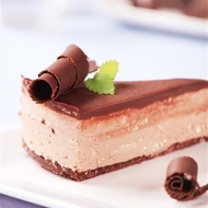 Dip the mold with the set cheese mixture into hot water for a few seconds, then carefully turn out the contents onto the prepared cake base. Spread a thick layer of fruit jam on top and cover the entire cake with slightly warm, melted chocolate that has been tempered over a water bath. Refrigerate overnight.