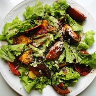 You can lightly fry the salami. There is no need to add oil to the finished salad, as the pumpkin is fried in oil. You can drizzle with 2 tablespoons of balsamic vinegar. Enjoy your meal! :)