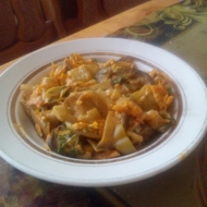 Add everything to a large pot, pour in the sour cream, add half a glass of water, and set to stew. When it boils, add salt, garlic, turmeric, any other spices to taste, and pepper.