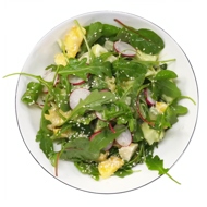 Place the salad leaves at the bottom of the plate, top with the vegetables and sauce, and garnish with radish slices and sesame seeds.