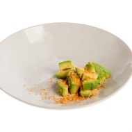 Cut the avocado in half, remove the pit, and use a spoon to separate the flesh from the skin. Dice the flesh into large cubes.