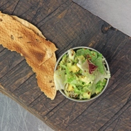 Dice the avocado into small cubes and mix it with the salad leaves (lollo rosso, frisée, and romaine).