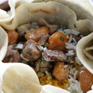Add the almond berries and chestnuts, mix well, and simmer everything together for another 2–3 minutes, then add to the rice and mix gently to avoid damaging the lavash.