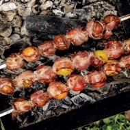 Take small cherry tomatoes, wrap them in cured bacon, skewer them, and grill them well over a barbecue.