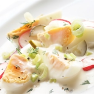 Top with sliced boiled eggs and sprinkle with finely chopped herbs.