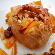 Reduce the oven temperature to the minimum. Place the dish in the oven for 20–30 minutes (depending on your preferred level of doneness for the apples).
