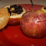 Cut off the top of the apples, scoop out the insides with a spoon, sprinkle sugar at the bottom, fill the apple with nuts and raisins in equal proportions, place a piece of butter on top, and cover with the apple 'lid'.