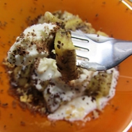 Place a couple of banana slices on a plate, top with ice cream, and crumble the cookies on top. Drizzle with the juice left from the lemon in the dish and sprinkle with grated chocolate.