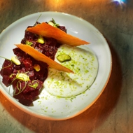Arrange the beetroot on a plate, placing the whipped feta beside it. Sprinkle both with chopped pistachios and garnish with garlic chips.