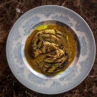 Prepare the cabbage. Take a medium-sized head of young cabbage (you can use either red or green cabbage; the latter is slightly denser and takes a bit longer to cook), drizzle with olive oil, and sprinkle with salt and crushed black pepper. Wrap it in two layers of aluminum foil and place it in the oven for 1.5 to 2 hours at 446°F. If you have a charcoal grill, cook it there instead — in about an hour and a half, the cabbage will reach the desired texture and develop a wonderful smoky flavor. Then, unwrap the cabbage, remove any burnt outer leaves, and cut the cabbage into wedges.