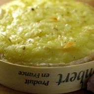 Cut the top off the Camembert, then insert the garlic slices into the cheese (to taste).