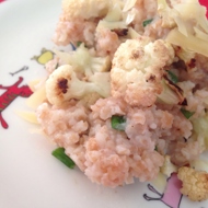 Preheat the oven to 428°F. Break the cauliflower into florets and toss them in a bowl with olive oil, seasoning with salt and pepper to taste. Spread them out on a baking sheet lined with parchment paper and roast for twenty to twenty-five minutes.
