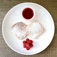Remove the pancakes from the oven and let cool. Serve with raspberry sauce. Garnish with berries and powdered sugar when serving.