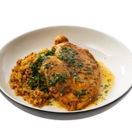 Add the parsley and the juices released from roasting the chicken breasts, and mix with a whisk. Drizzle this sauce over the chicken and the side dish.