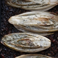 Return the skillet to the heat, melt the remaining butter, place the chicory cut side down, and sauté until golden brown, then transfer to the baking dish cut side up and brush with honey.