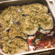 Grease a baking dish with high sides with oil. Lightly cover the bottom with tomato sauce. Then layer some of the eggplants.