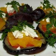 Baked eggplants with bell peppers, tomatoes, and feta cheese