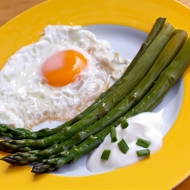 Place the cooked asparagus and eggs onto six pre-warmed plates. Serve immediately.