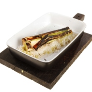 Remove the string from the cooked leek, open it up, drizzle with green sauce, and serve.