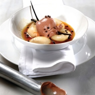 Place a scoop of chocolate ice cream in each bowl, arrange 2 pears around it along with the caramelized mixture. Sprinkle the dish with black pepper and drizzle the pears with 1 tablespoon of olive oil.