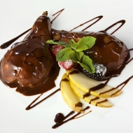 Serve the pears with cherries on serving plates and drizzle with warm chocolate sauce.