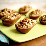Fill the centers of the pears with the previously prepared oatmeal mixture. Bake for 25 minutes, until the pears are soft and the filling is lightly browned.