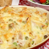 Mix thoroughly, transfer the pasta to a baking dish (not glass), and place it in an oven preheated to 374°F. Bake for 15 minutes on the middle rack.