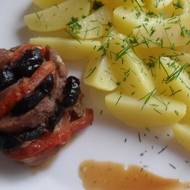 Insert a slice of tomato and a prune into the incisions in the tenderloin.