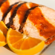 Place the meat in a baking dish and put it in the oven, occasionally basting it with the remaining marinade. The cooking time is about 1 hour and 40 minutes. Approximately 20 minutes before it’s done, cover the meat with orange slices and zest.