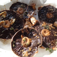 Turn the mushrooms upside down, brush them well with the marinade, and pour the remaining marinade over the stems and mushrooms — ideally, let them marinate for about 20 minutes, but you can cook them right away.