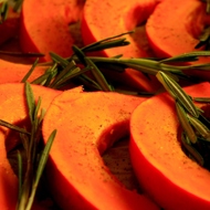 Preheat the oven to 356°F. Line a baking sheet with parchment paper and place the pumpkin on it. Season with salt and pepper, and add sprigs of rosemary. Bake in the oven for 20–25 minutes.