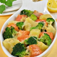 Layer the vegetables and fish in a greased baking dish, then pour the cream mixture over them. Bake for 20 minutes at 220°C.