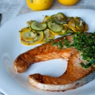 Quickly rinse the salmon steaks and pat them dry. Mix freshly ground black pepper and salt, and rub the mixture onto the steaks.