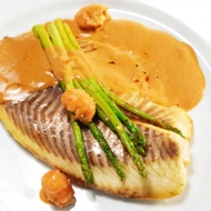 Preheat the oven to 356°F. Place the pomfret fillet in a single layer at the bottom of a baking dish, season with salt, and drizzle with oil and wine.