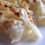 In a bowl, mix the milk and cream and pour it into the dish. Bake in the oven for about 30 minutes covered with foil. Then remove the foil and bake for another 30-40 minutes until cooked through and golden brown.