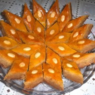 Then cut the baklava into diamond shapes measuring 10x4 centimeters, brush with egg yolk, and place a hazelnut or almond in the center of each diamond. Bake for 40–45 minutes at 180–392°F. Meanwhile, prepare a syrup by mixing one cup of powdered sugar with one cup of hot water. Pour the hot syrup over the baked baklava and return it to the oven for another 7 minutes.