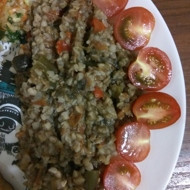 Mix the buckwheat and eggplants, and serve with cherry tomatoes and herbs.