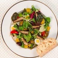 In a salad bowl, mix the salad greens, olives, chopped eggs, and vegetables. Season with salt and pepper, and dress with the olive-oil vinegar dressing. Add the sprats and gently mix.