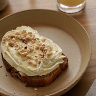 Cut the finished bread into eight portions, spread peanut butter on each piece, and top with thinly sliced banana. Finish with whipped cream on top of the banana.