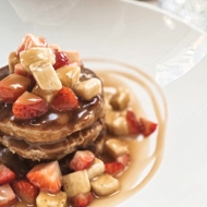 Place the finished pancakes on a plate along with the sliced remaining banana and strawberries, drizzle with caramel, and serve.