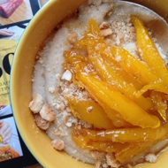 Serve the porridge on warmed plates, crumbling one shortbread cookie over each serving and arranging the mango slices on top. If desired, drizzle with the remaining syrup.