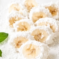 Dip the peeled bananas in whipped cream, then roll them in shredded coconut.